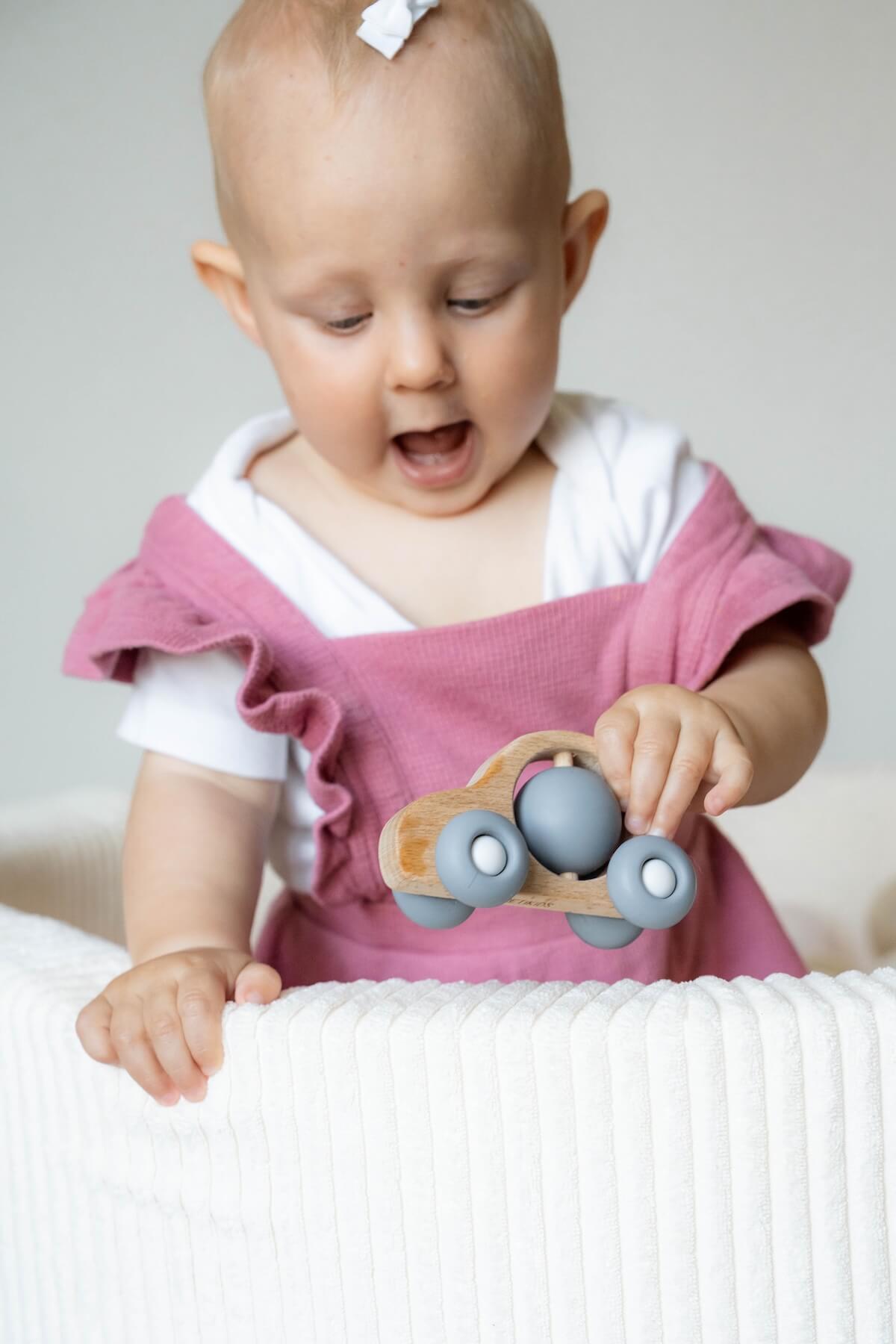 Das Zusammenspiel aus glattem Holz und weichem Silikon fördert die Motorik, regt die Sinne an und sorgt für leuchtende Kinderaugen.